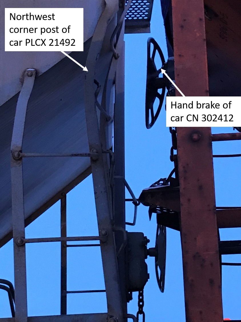 Once on the B-end platform, the foreman applied the high-mounted hand brake but could not stop the uncontrolled movement. Subsequently, the southeast corner of CN 302412 collided with the northwest corner of empty covered hopper car PLCX 21492, which was stationary and foul of the MR-lead track. The foreman became pinned between the corners of the cars (Figure 4) and received fatal injuries. There was no derailment and no dangerous goods were involved.