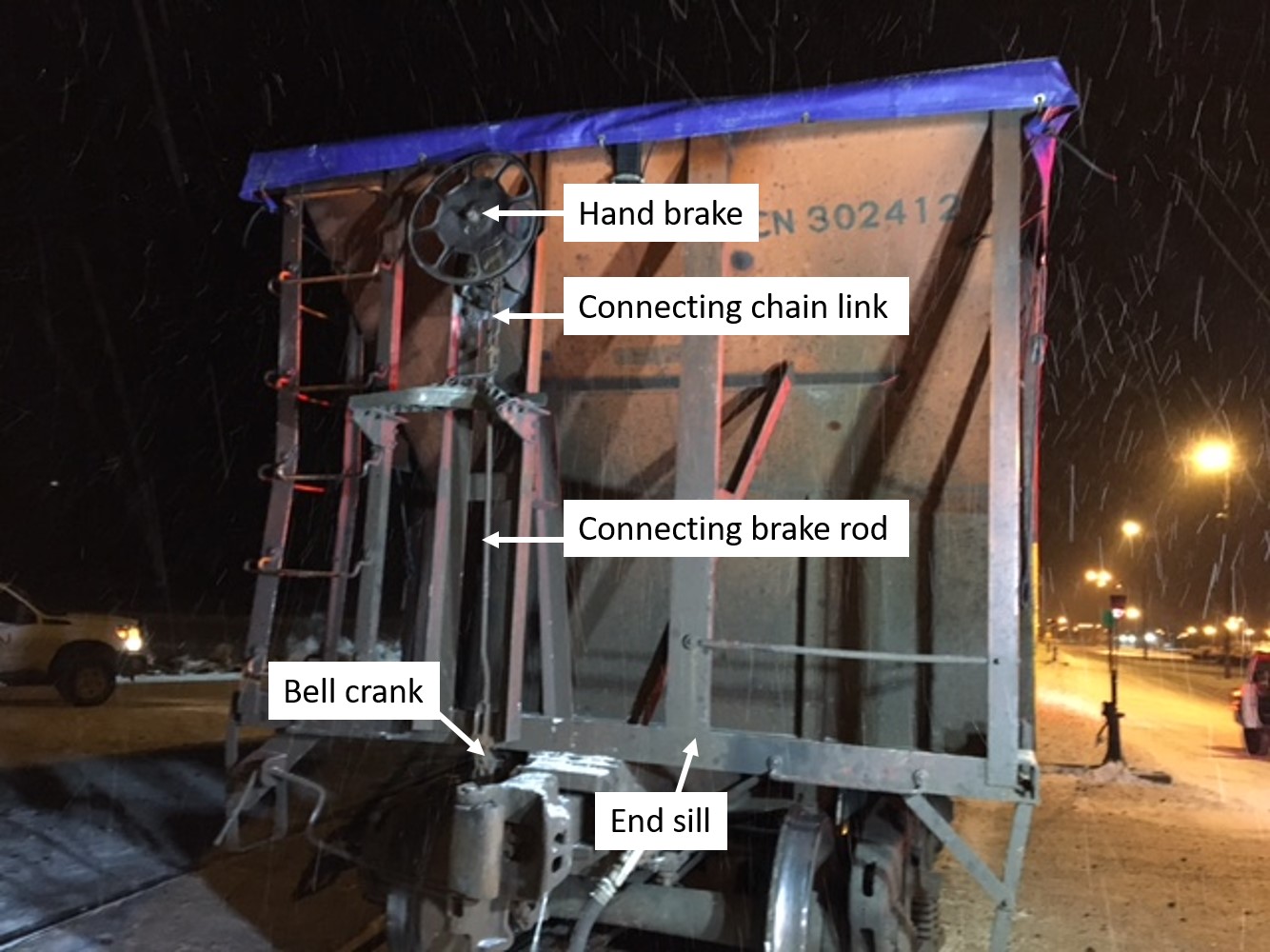 CN’s examination of car CN 302412 immediately following the accident determined that the hand brake chain, the connecting rod, and the bell crank were not in their proper positions. The large connecting chain link had pulled up close to the hand brake housing while the hand-brake connecting rod and the bell crank were pulled tight against the end sill (Figure 5). There was no white paint visible on the hand brake chain.