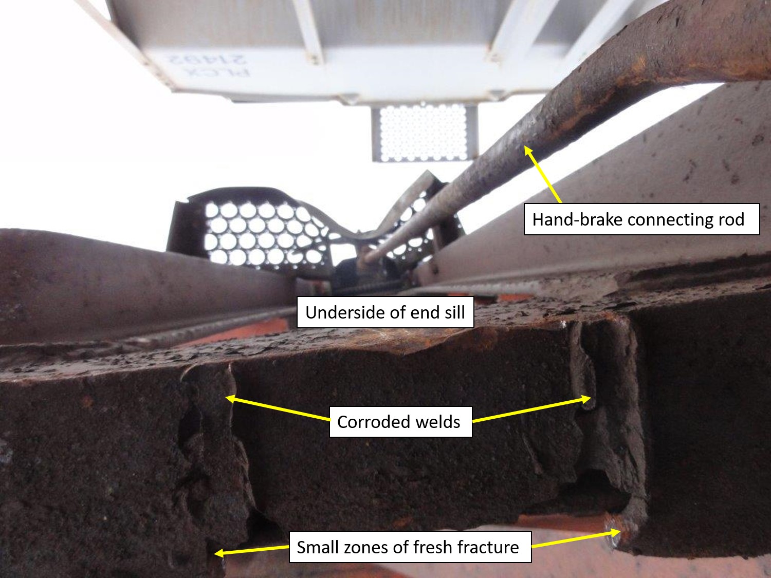 Examination of the bell-crank bracket and the bell crank determined that the welds securing the bell-crank bracket to the underside of the CN 302412 B-end sill had failed, and the bracket fracture surface contained 2 small zones of fresh fracture (Figure 7).