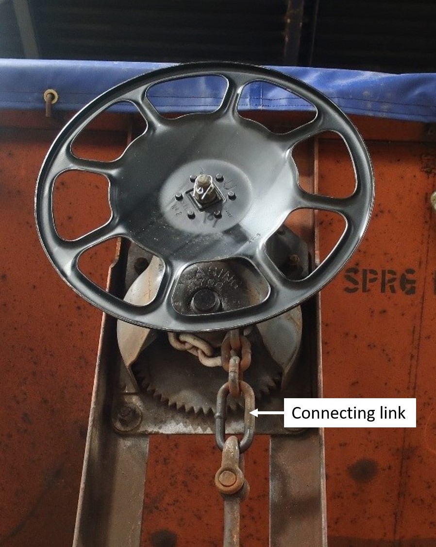 With the hand brake fully applied, the positions of the repaired hand brake components were compared to the position of the components following the accident, but before repairs (Figure 5). Before repairs, the large connecting chain link had pulled up close to the hand brake housing rather than remaining below the housing. In addition, the hand-brake connecting rod and bell crank were pulled tight against the end sill.