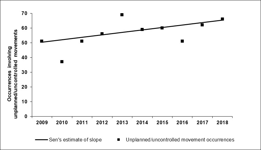 Between 2009 and 2018, 562 unplanned/uncontrolled movements occurred. There has been an upward trend during this 10-year period. The average increase per year for all categories was 1.67 occurrences, with 86% of the overall increase associated with switching without air. Of the 185 occurrences involving switching without air, 70 (38%) occurred as a result of rollbacks and 56 (30%) involved dangerous goods. The major outcomes of these occurrences were collisions (134, or 72%) and derailments (76, or 41%). Two of the occurrences (1%), including this occurrence, involved an employee fatality.