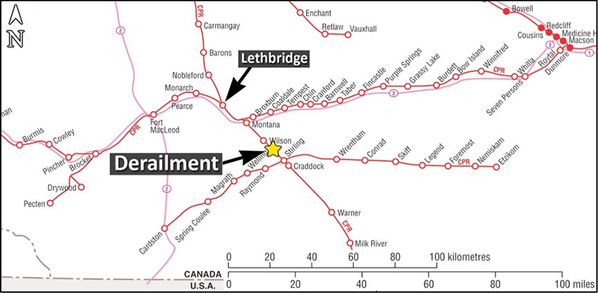 On 30 July 2018, a Canadian Pacific Railway (CP) train crew was ordered for 1230Footnote 2 in Lethbridge, Alberta (Figure 1). The crew was scheduled to operate freight train A13-31 southward on the Montana Subdivision from Lethbridge (Mile 64.8), to Coutts, Alberta (Mile 0.0), at the Canada/U.S. international border. The train departed at about 1355.