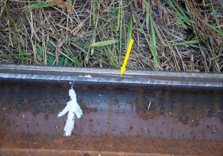 Based on the wheel flange marks across the rail head (Figure 2), the high rail had likely canted outwards, allowing the wheel on the inside rail to drop into the gauge. For lateral forces of 10 to 12 kipsFootnote 12 to cause the gauge to spread, weakened securement of the rail (e.g., poor tie condition) was likely present.