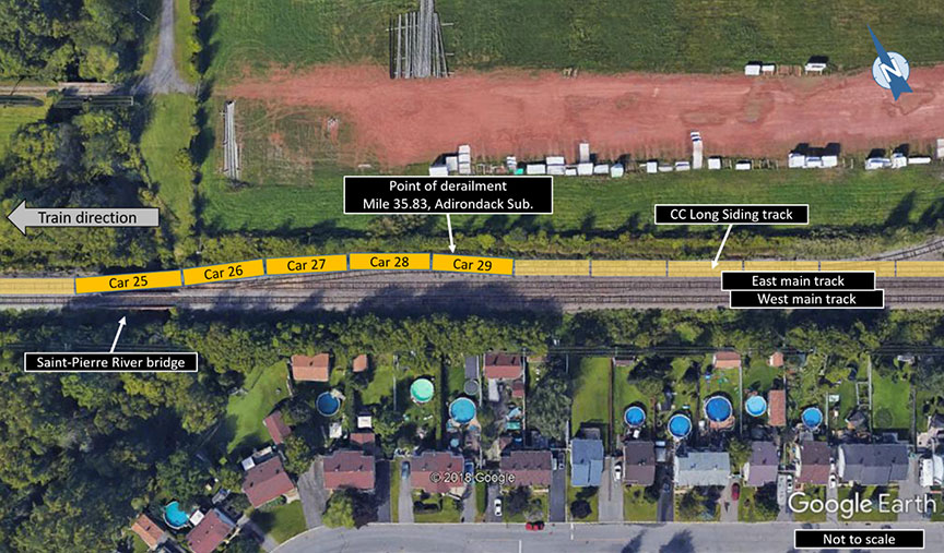 - The lead locomotive had stopped near Mile 36.19, to the north of the Saint-Pierre Street public level crossing, blocking it for several hours.