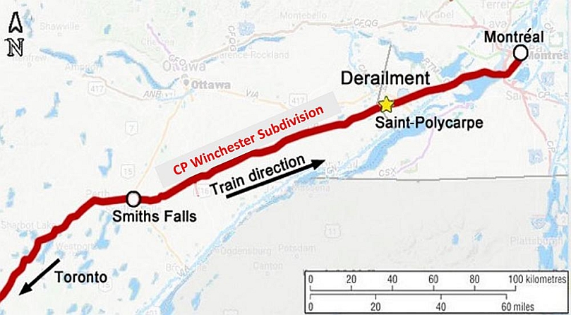 On 16 July 2018, at approximately 1110,Footnote 1 after receiving a mechanical pre-departure inspection,Footnote 2 Canadian Pacific Railway (CP) conventional freight train 142-14 departed eastward from CP’s Agincourt Yard in Toronto, Ontario, en route to Montréal, Quebec. The train consisted of 2 locomotives, 76 loaded cars, and 19 empty cars. It was 9405 feet long and weighed about 11 260 tons. The train received a pull-by inspection during a crew change at Smiths Falls, Ontario. No exceptions were reported. The train crew—a locomotive engineer and a conductor—were qualified for their respective positions and familiar with the territory, and they met fitness and rest standards.