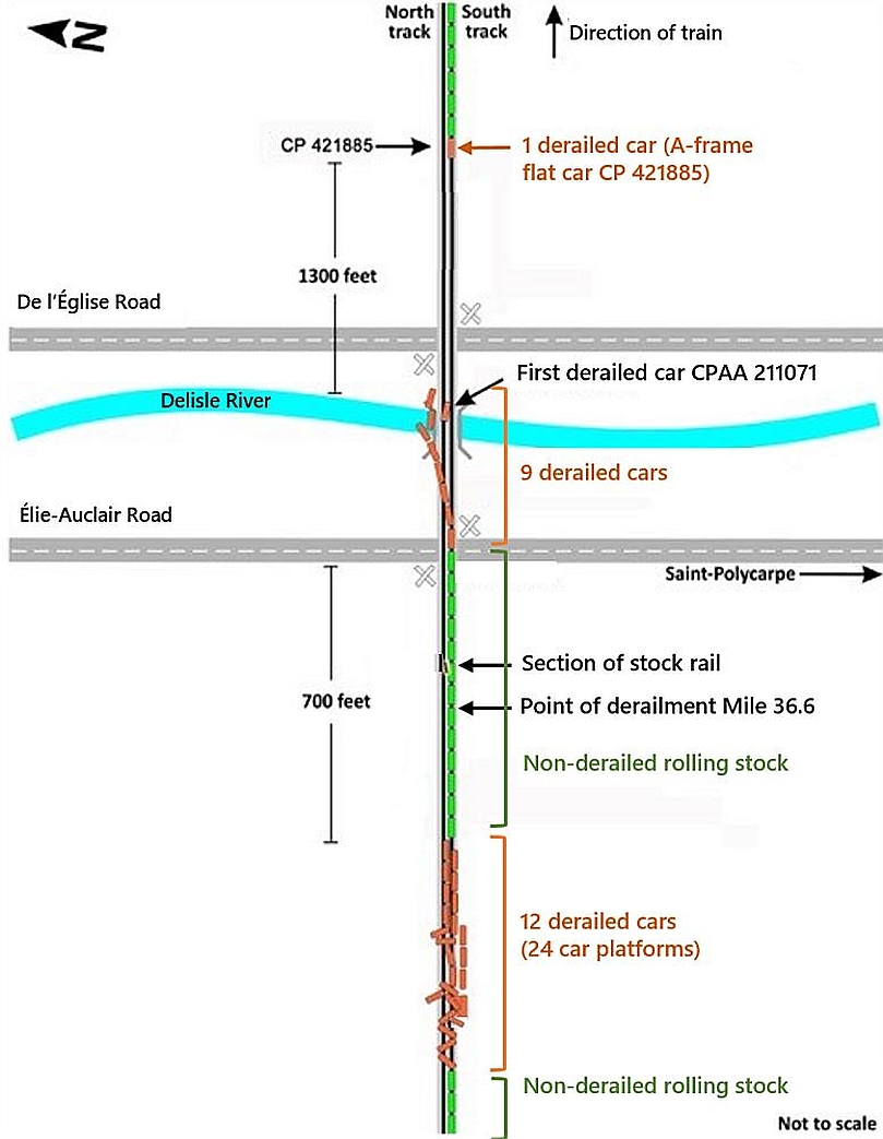 The lead truck of the car derailed approximately 400 feet west of the Élie-Auclair Road crossing (the point of derailment), but the car proceeded until it reached the Élie-Auclair Road crossing, where it struck the crossing surface, fully derailed, and separated from the train, leading to the derailment of the 8 trailing cars. The derailed cars destroyed the track structure east of the crossing as they slid off the bridge to the river below.