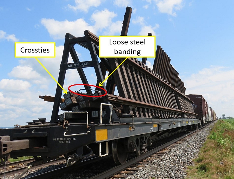 This securement technique did not provide a sufficient lateral restraint. Over the 2400 kilometres (1500 miles) travelled by the car under normal train operation, the load of crossties with the heavier stock rail on top gradually shifted laterally and fell over, allowing the 2 loops of steel banding to come loose.