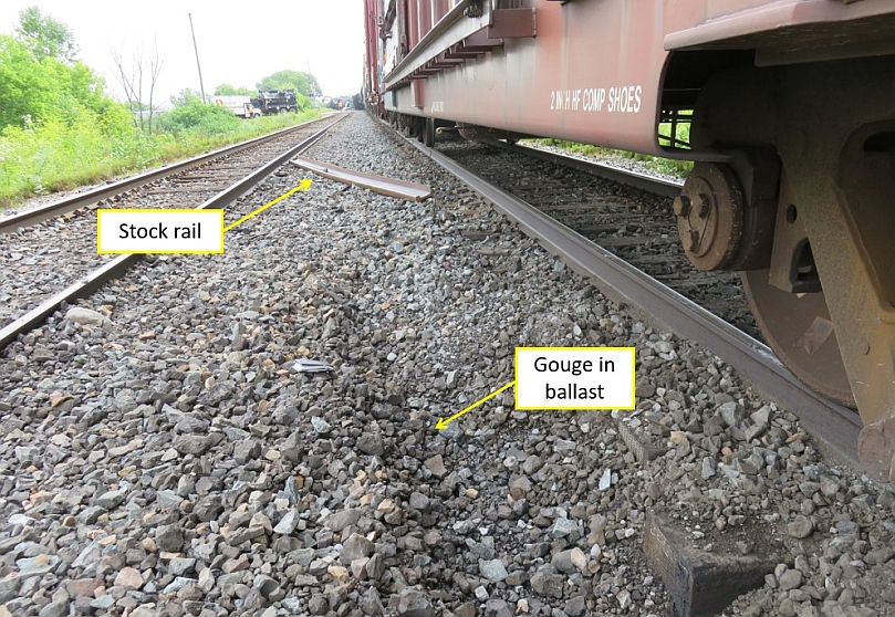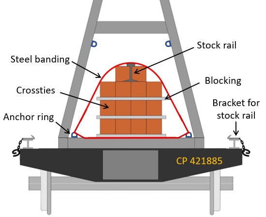 - The stock rail was loaded on top of the stacked crossties, instead of being loaded on the mounting bracket on the side of the car. The investigation could not determine why the stock rail had not been loaded onto the mounting bracket on the side of the car, as per CP practice.