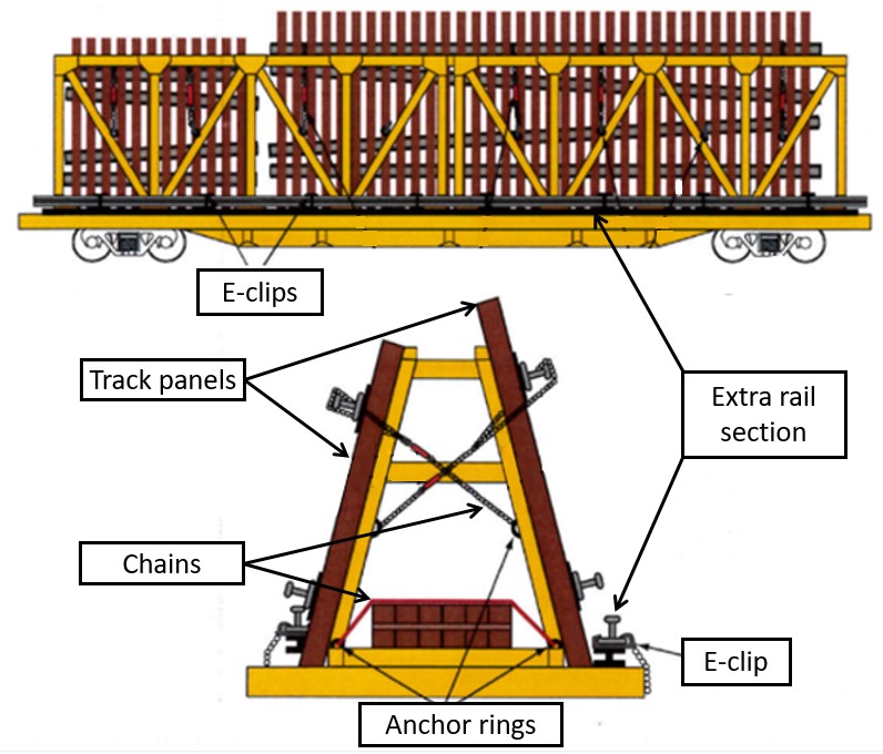 In April 2018, when the Railway Association of Canada (RAC) issued Circular RAC 12010, new instructions were provided for the loading and securement of A-frame flat cars. These instructions included the requirement to use chains and anchor rings to secure track panels and cargo under the A-frame. In addition, sections of stock rail were required to be mounted to brackets on the side of the car using e-clips.