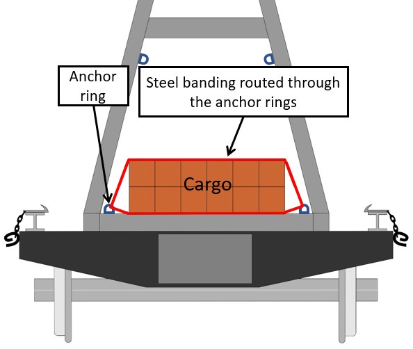 - Material loaded on the car deck beneath the A-frame was secured using steel banding routed through the car deck and around the centre beam.