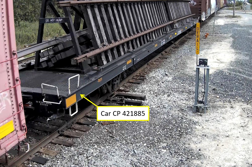 - The derailment occurred when the leading end of loaded box car CPAA 211071 struck a stock rail 21 feet long that had fallen from the end of the preceding car, A-frame flat car CP 421885.