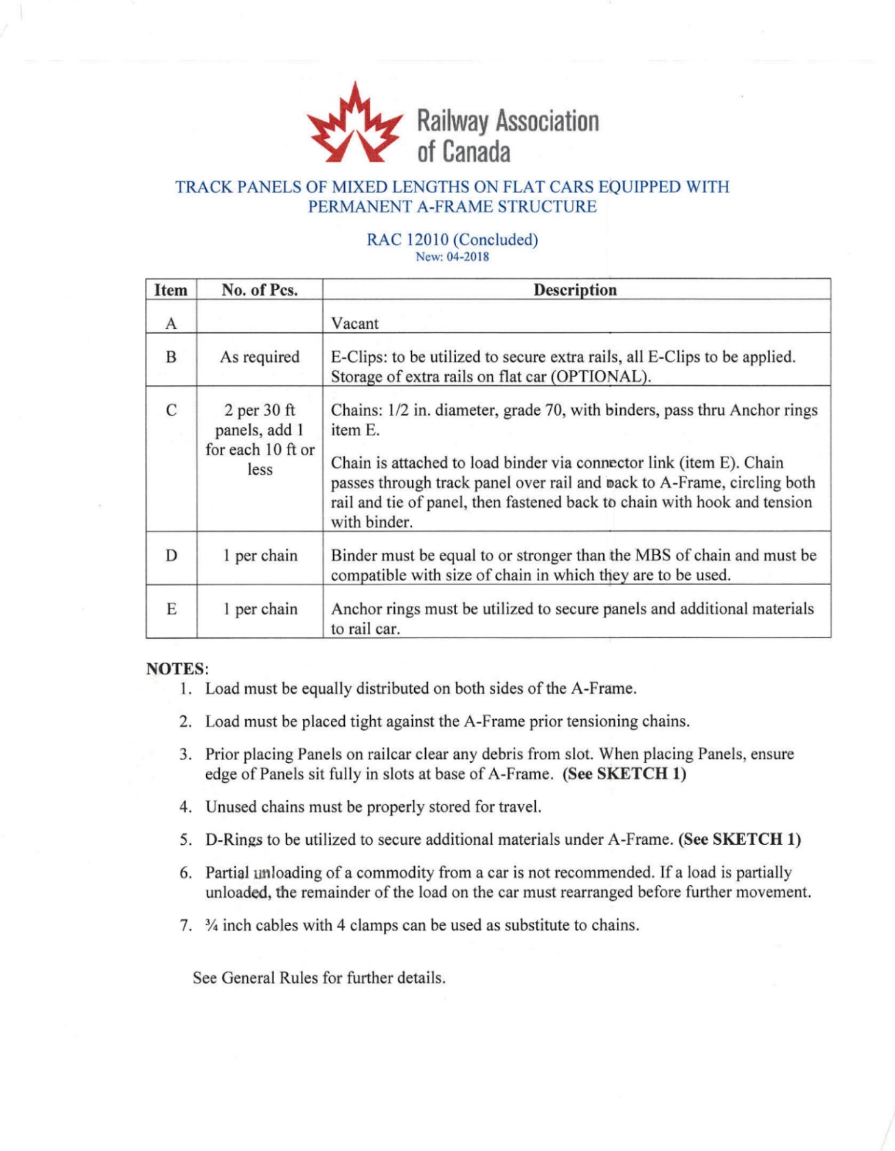 Appendix A – Railway Association of Canada, Circular RAC 12010: Track Panels of Mixed Lengths on Flat Cars Equipped with Permanent A-Frame Structure