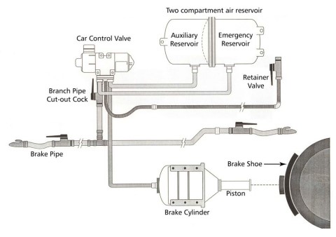 The car control valve on a freight car reacts to an abrupt drop in air pressure by allowing air pressure stored in the emergency reservoir to flow into the brake cylinder. The auxiliary reservoir is also used during an emergency brake application. This causes a faster and higher build-up of brake cylinder pressure, resulting in a harder brake application and a faster stop.