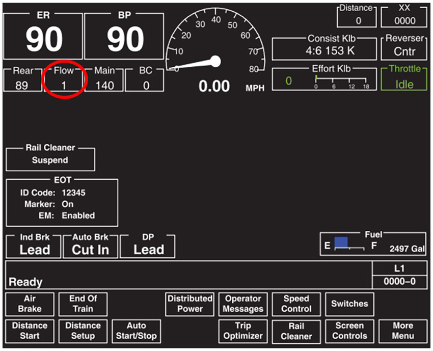 On locomotives equipped with operator display screens, the airflow is displayed in a box identified as “Flow” (Figure A5). The value displayed on the screen indicates the amount of airflow into the brake pipe in CFM. On this type of airflow indicator, when the demand for air falls below 20 CFM, it will display 0.Footnote 80