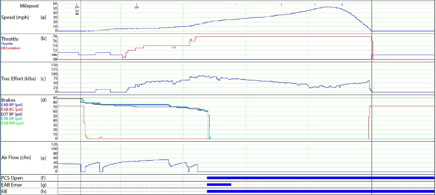 Row (c), Trac Effort, depicts tractive effort measured in kips . Tractive effort transitions from a pulling force to a retarding force when the locomotives are taken out of throttle and moved into DB mode. This plot generally follows Row (b ), Throttle / DB Excitation. Note how tractive effort in DB decreases as the maximum speed of the train is reached, then increases as the train slows. This is consistent with expected DB performance under these circumstances.Footnote 81