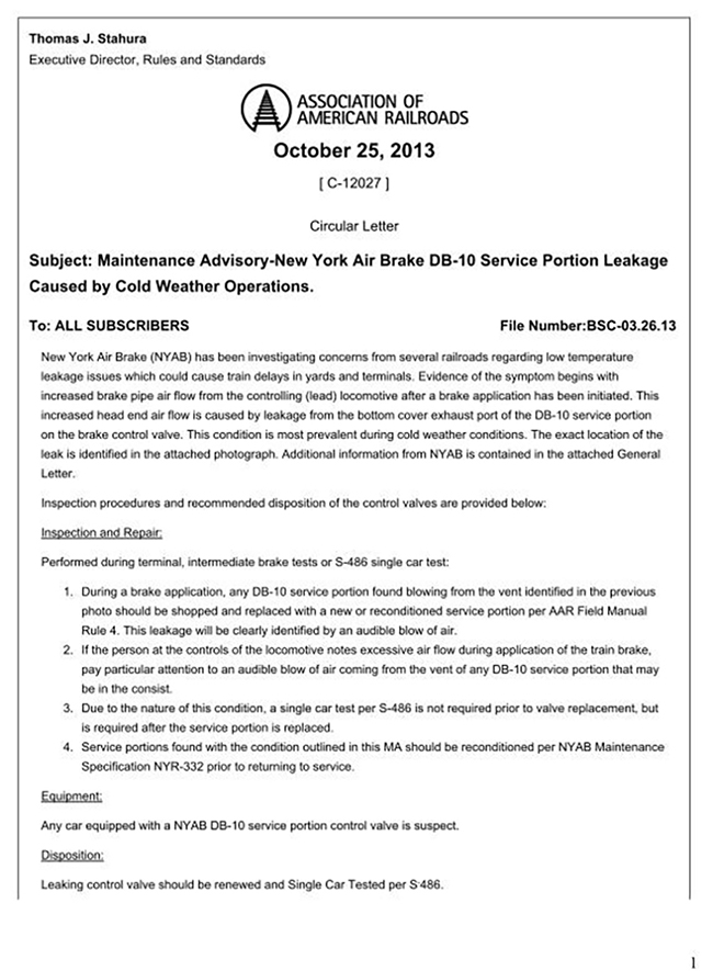 - The DB-10 service portion failures reported by Canadian National Railway Company (CN) were determined to be the same as the balancing valve issue that was evaluated in 2013 and covered under Association of American Railroads (AAR) Circular Letter C-12027 and NYAB General Letter GL-490 (Appendix C).
