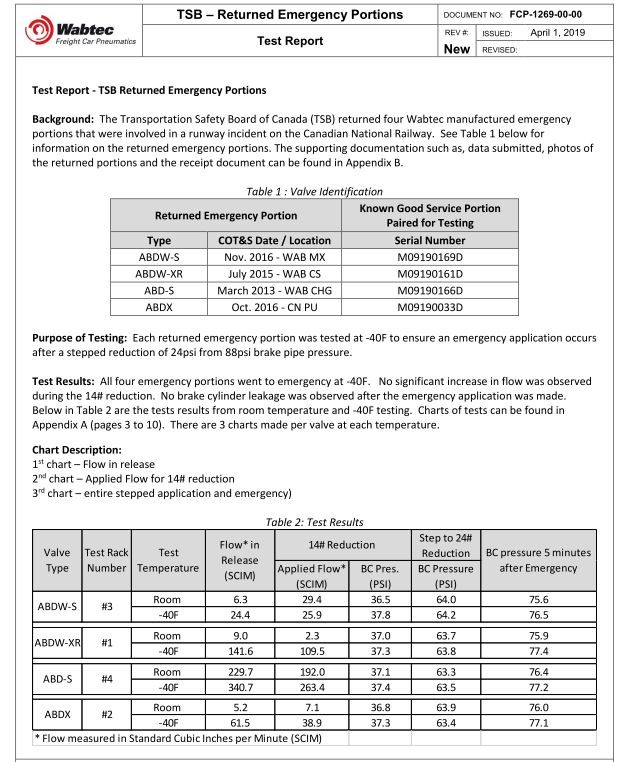 Appendix E – Wabtec test report of emergency portions returned by the TSB