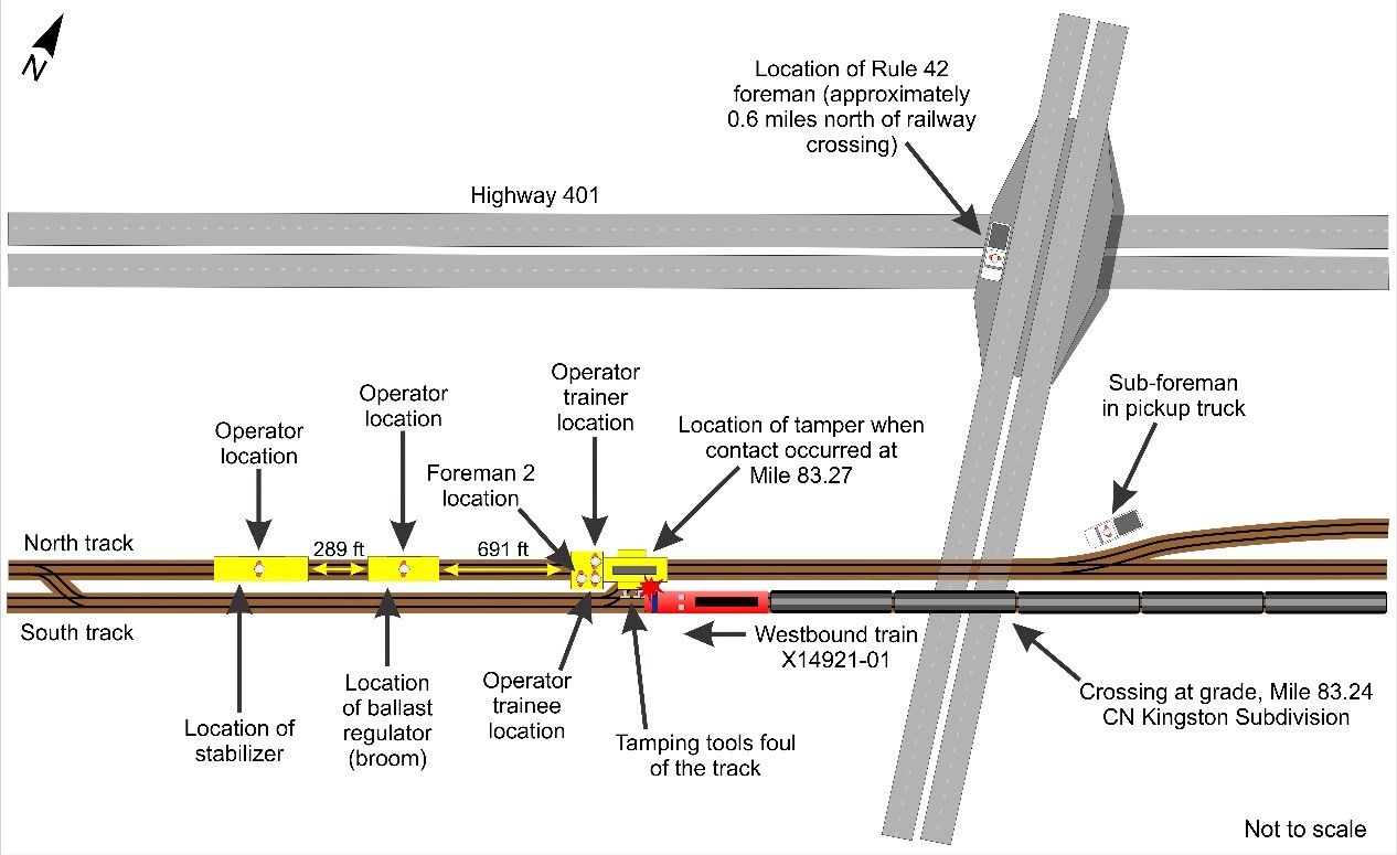 The sub-foreman, who was performing other operational duties, was in his truck, which was positioned on the north side of the railway right-of-way, about 250 feet east of the track maintenance machines that were under his protection (a track stabilizer, a ballast regulator, and a tamper). From his location, the sub-foreman was not in a position, nor required, to see the south side of the track maintenance machines, including the tamper.