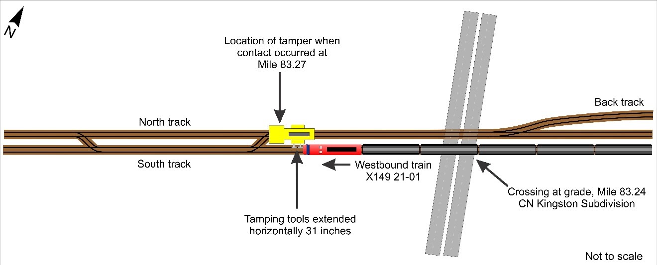 On 02 October 2018, at about 0010, with the westbound train travelling at about 48 mph on south track, the train crew observed that the tamping tools of the tamper were extended horizontally, foul of the south track (Figure 3). The train struck the tamping tools, and the crew applied the train brakes and brought the train to a controlled stop. There were no injuries. The tamper sustained damage to its tamping tools. The train sustained damage to safety appliances (ladders and sill steps) on both locomotives (IC 2721, CN 2679) and 3 cars. Seven other cars sustained minor damage (scrape marks).
