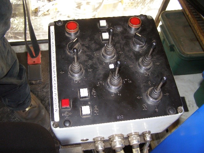 The Unimat tamper crew must maintain awareness of the lateral extension of tamping tools, particularly when trains or vehicles have the authority to travel on an adjacent track. Control boxes for the tamping tools are located at the operator control stations on each side of the cab of the tamper. Each control box has 2 rotary switches and 2 joysticks for lateral movements (left and right in the horizontal plane) (Figure 8).