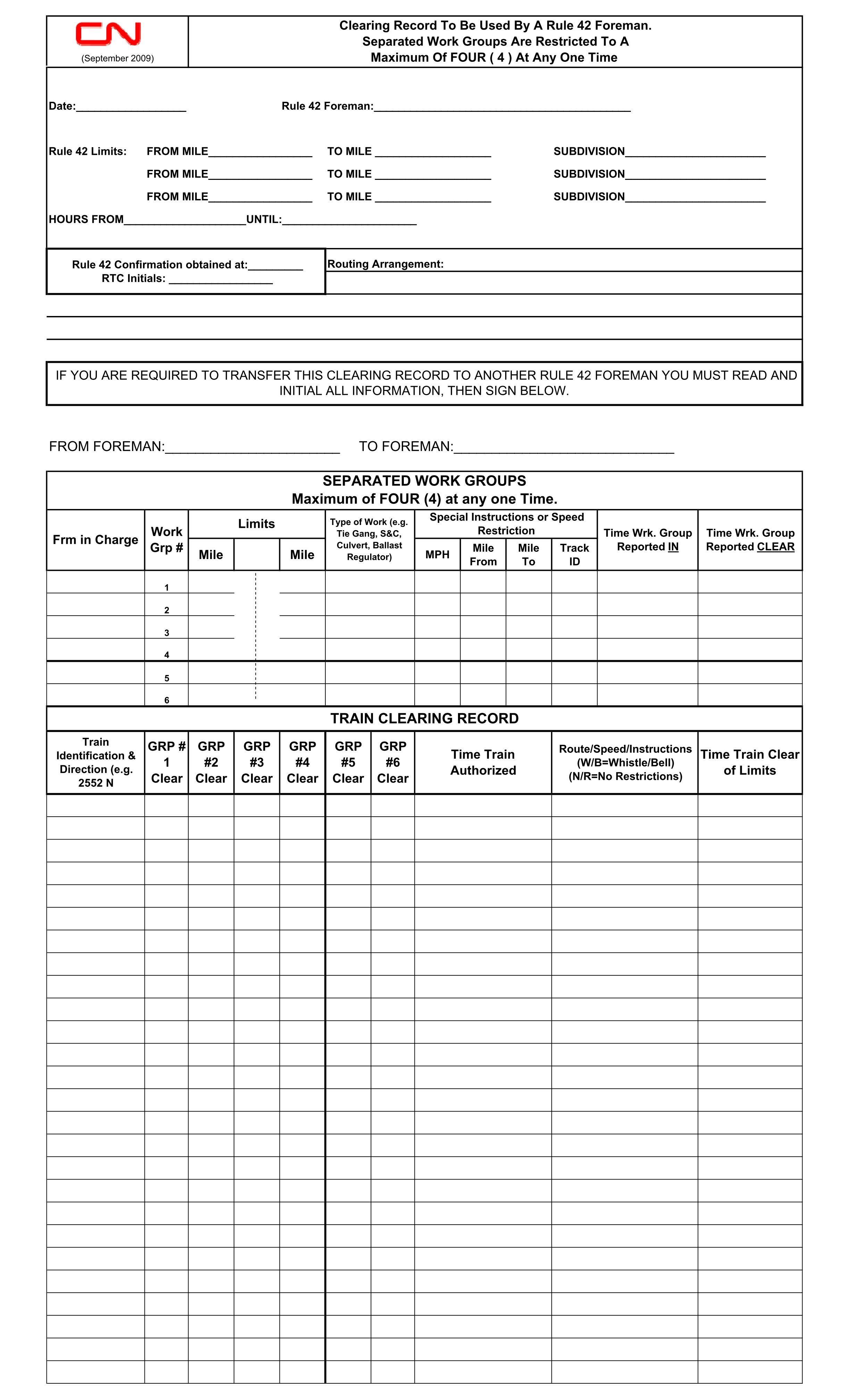 CROR Rule 42 gives the designated foreman responsibility to ensure that the track is clear of workers and machines and is safe for the passage of trains before permitting a train to pass through the limits. Railway Rule 42 procedures establish the use of a clearing record form for Rule 42 foremen to be used as a memory aid (Appendix B). This form provides a convenient location for Rule 42 foremen to record particulars of the Rule 42 planned protection, such as the track and time limits, the time the Rule 42 was confirmed to the RTC, the RTC’s initials, and the names of employees to whom they have granted sub-foremen protection to protect separated work groups under the Rule 42.