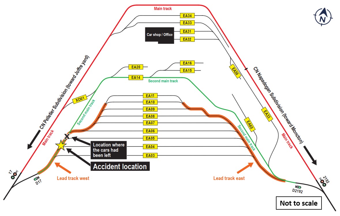 At Edmundston Yard, train speed is governed by the applicable provisions of Rule 105(c)Footnote 2 of the CROR and by CN Time Table 84.Footnote 3 According to these provisions, trains must not exceed 10 mph in the yard. In addition, according to Rule 83(c) of the Summary Bulletin in effect at the time of the occurrence,Footnote 4 when switching in the yard, air brakes must be applied through the entire consist.