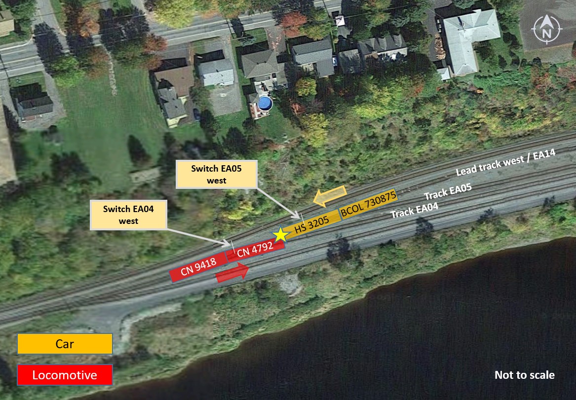 At the occurrence site, the 2 locomotives of the locomotive consist and the cut of 2 cars were straddling the west lead track as well as the EA05 West and EA04 West turnouts. No rolling stock had derailed, and the tracks were undamaged.