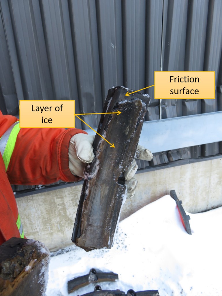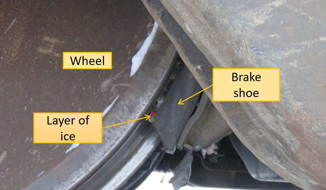 There was snow and ice around the brake shoes on all of the trucks of car HS 3205. The brake cylinder pressure on the carFootnote 8 was approximately 70 psi, and the brake piston was extended. All brake shoes were applied against the wheels. A layer of ice was visible between the brake shoes on 7 of the 8 wheels of the car (Figure 4).