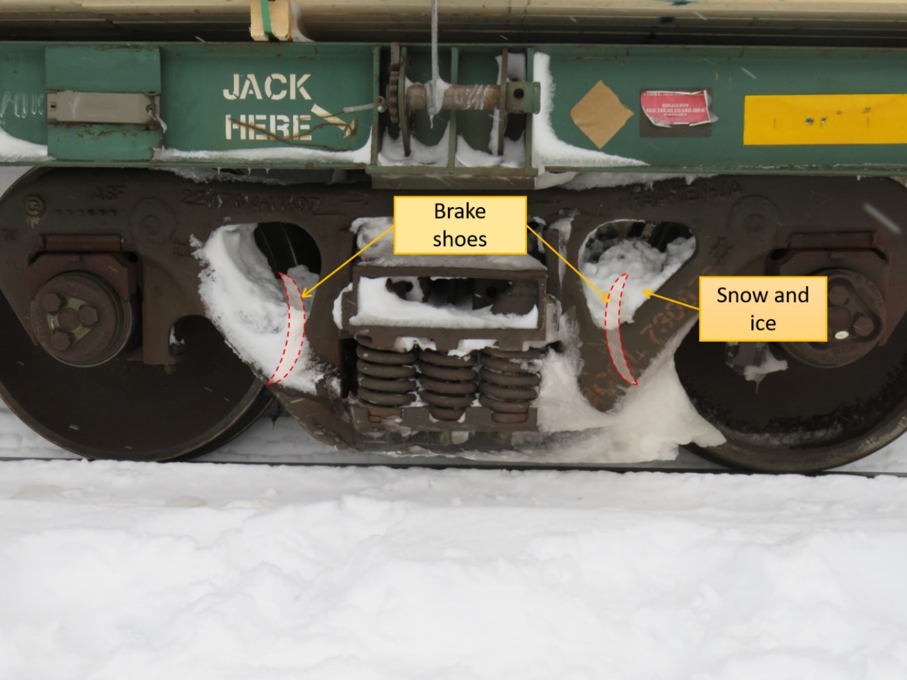 The notice also stated that snow and ice accumulation on braking surfaces and in brake rigging can dramatically reduce the effectiveness of train brake systems.