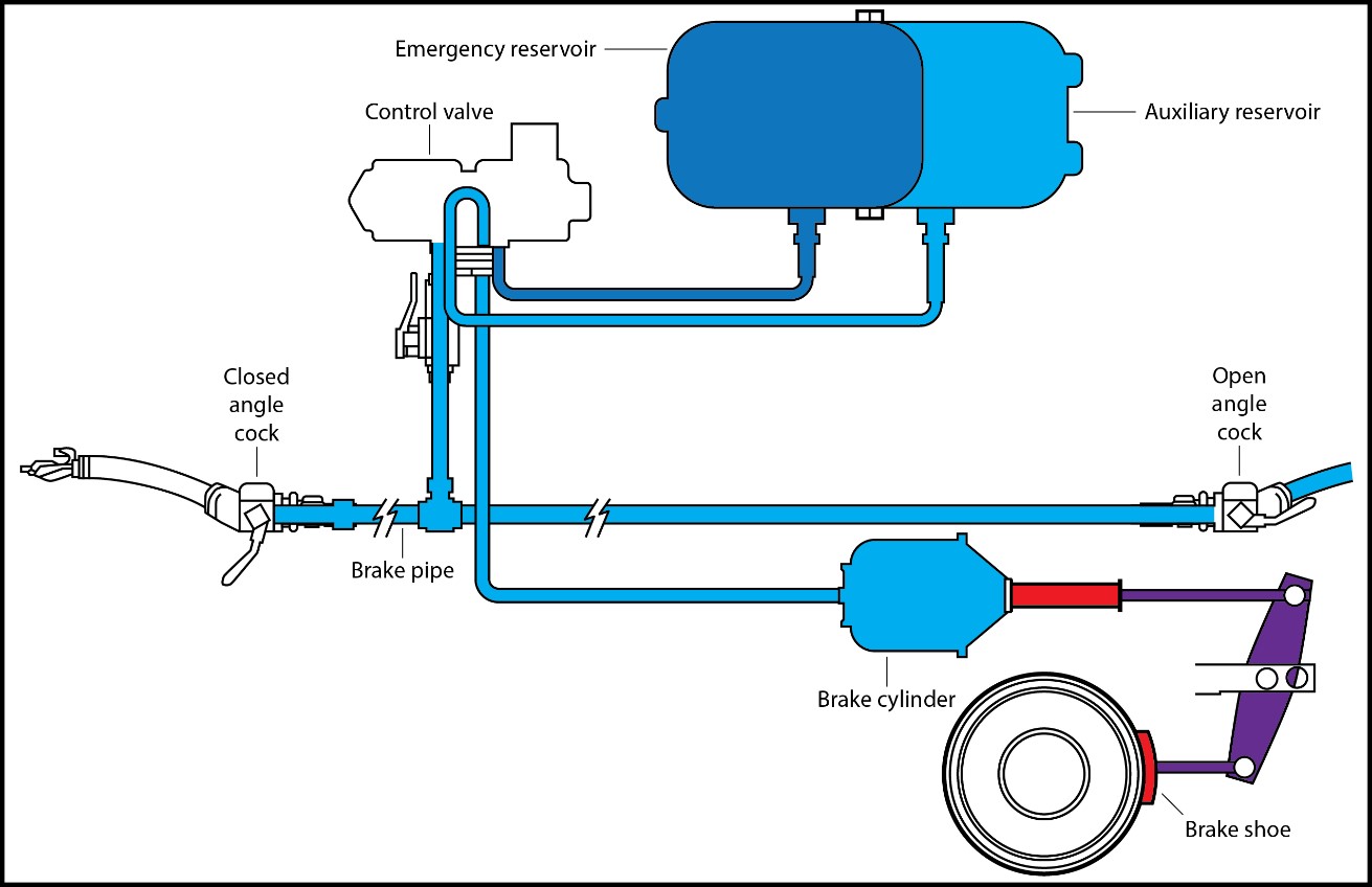 Each car has 2 air reservoirs: an auxiliary reservoir and an emergency reservoir. The auxiliary reservoir supplies air to the brake cylinder when the service brakes are applied. When the emergency brakes are applied, the brake cylinder receives compressed air from both the emergency reservoir and the auxiliary reservoir, which generates a greater braking force than service braking.