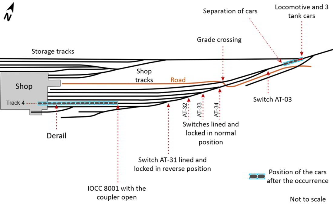 There are multiple tracks that lead to the shop. The switches of turnouts AT-34, AT-33 and AT-32 were in normal position and locked. The switch at turnout AT-31 was in the reverse position and locked,Footnote7 which allowed rolling stock access to track 4. Blue flag protectionFootnote8 is not required on these tracks.