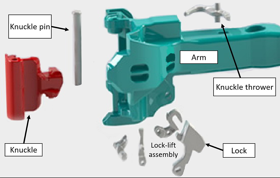 The type F coupler assemblyFootnote16 includes the coupler arm, the knuckle, the knuckle pin, the knuckle thrower, the lock, and the lock-lift assembly (Figure 6).