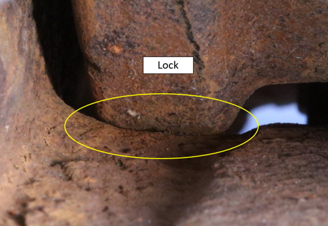 During laboratory testing with all the original parts, it was observed that the lower corner of the lock did not drop into the locked position when the knuckle was closed slowly. The lock caught on the back of the locking hole because of accumulated corrosion (Figure 7). This interference prevented the lock from working properly.
