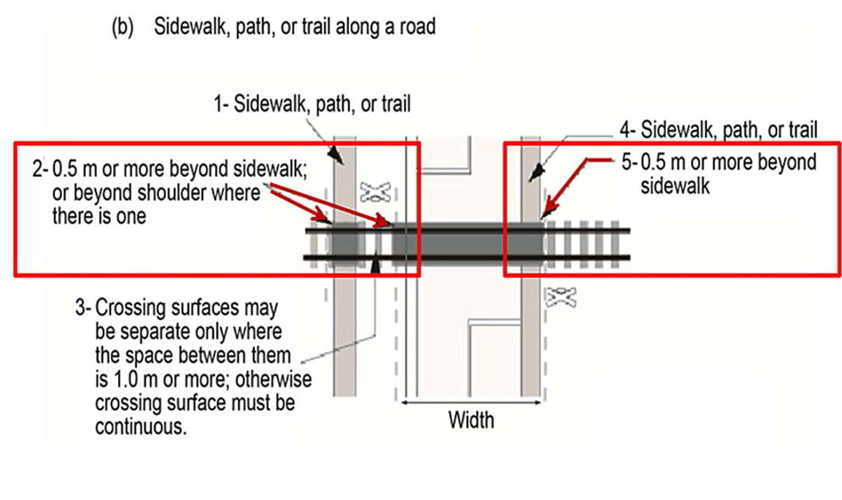 All sidewalks in the City of Chilliwack are designed for use by persons using assistive devices, including sidewalks at railway crossings. However, in the documents shared between the railway and the road authority (as required by Transport Canada’s Grade Crossings Regulations), Footnote 8 there was no indication that this crossing was designated for use by persons using assistive devices.