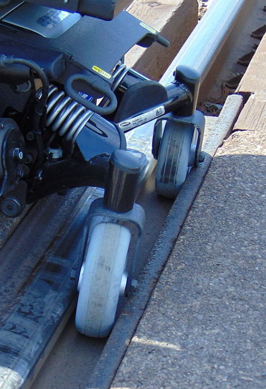- As the train neared the crossing, the motorized wheelchair became immobilized when the pedestrian, who had stopped with the rear wheels on the south rail (i.e., clear of the flangeway for the south rail), moved the motorized wheelchair in the opposite direction, and, as a result, both rear caster wheels fell into the flangeway gap of the south rail.