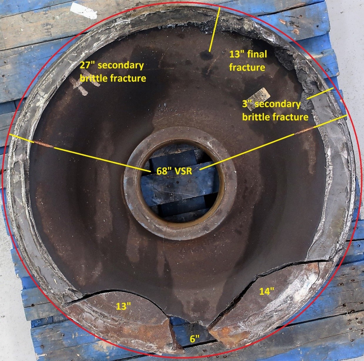 - Fractures extended into the wheel plate and resulted in the separation of the 3 pieces. The 6-inch wheel rim/tread piece was not recovered. Retracing the patterns observed on the fracture surface indicated that the VSR likely originated in the missing 6-inch tread piece.