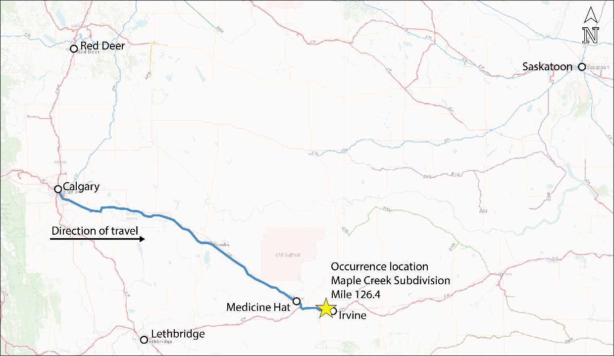 On 02 August 2019, at 1515,Footnote 1 Canadian Pacific Railway (CP) freight train 118‑01 was proceeding eastward at about 37.3 mph on the Maple Creek Subdivision when the mid-train remote control locomotive and the following 21 cars derailed at about Mile 126.4. The derailment involved 5 cars containing dangerous goods and occurred near the hamlet of Irvine, Alberta (Figure 1).