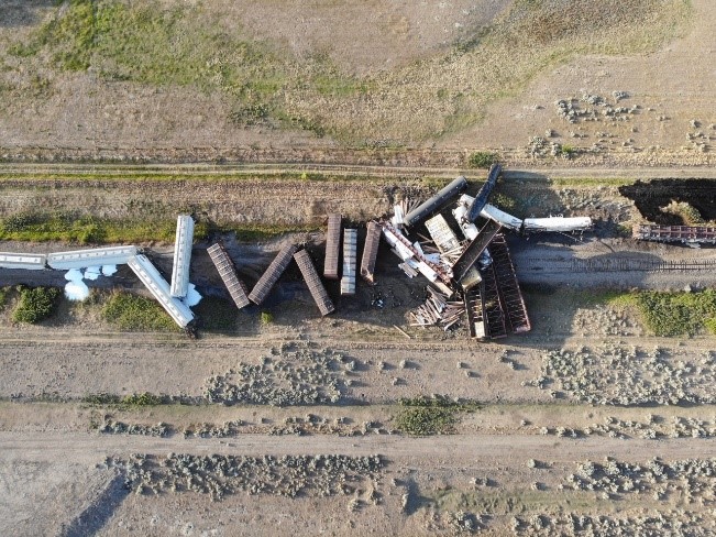 Additionally, there was a small grass fire reported near the right-of-way. The cars had derailed on both sides of the right-of-way in an accordion fashion (Figure 2).