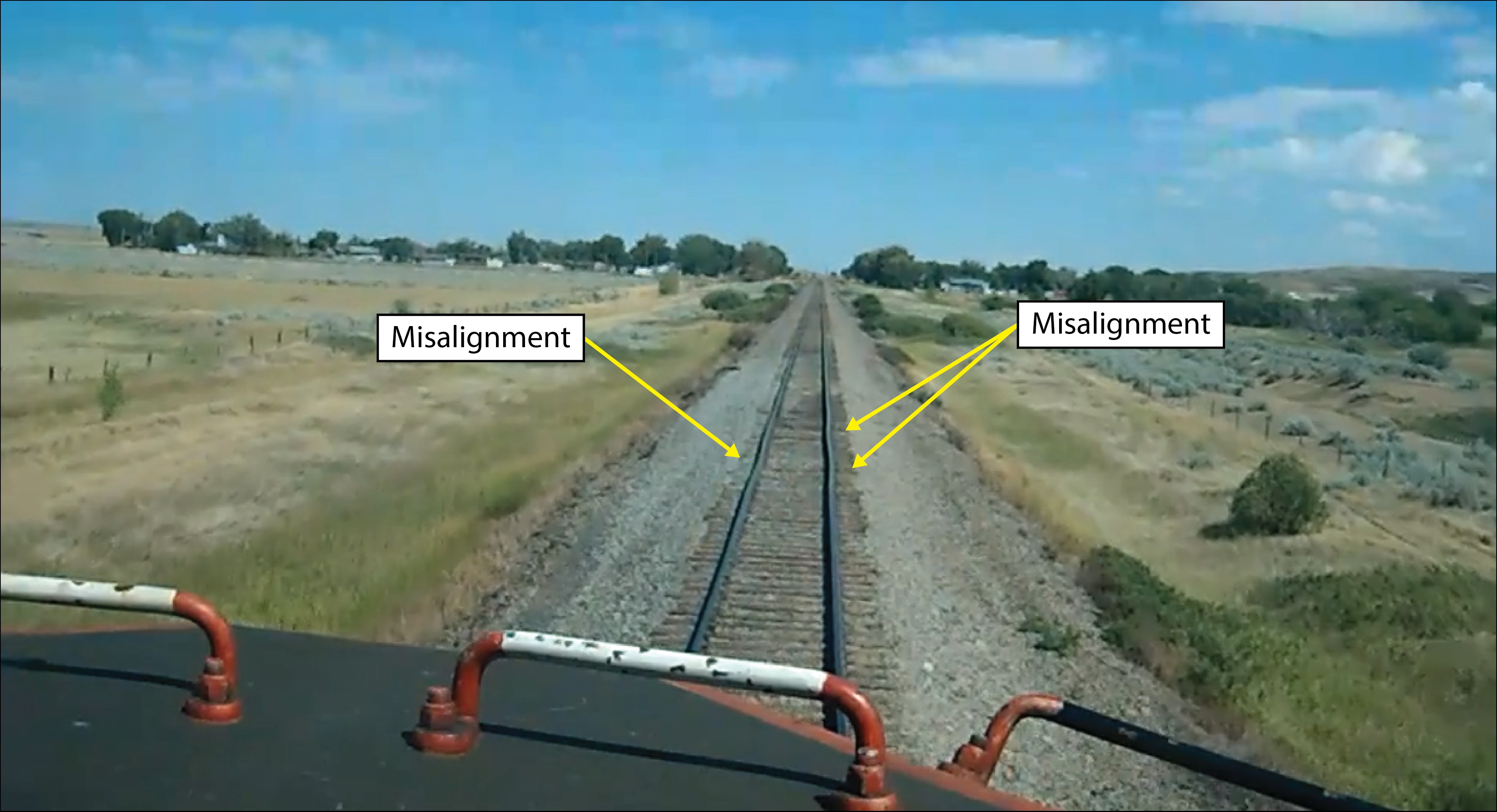 The lead locomotive was equipped with a forward-facing camera. In the vicinity of the derailment, the locomotive camera showed a small misalignment and fresh ballast dumped along the north rail.