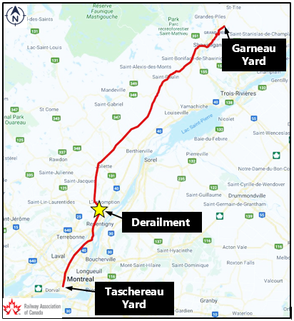 On 24 April 2019, a Canadian National Railway (CN) train crew was called for 0020Footnote 1 at Garneau Yard, in St-Georges-de-Champlain, Quebec. The crew was scheduled to operate freight train M36921-23 southward, from Garneau Yard (Mile 40.1 of the Joliette Subdivision) to Taschereau Yard (Mile 144.4 of the St-Laurent Subdivision). The required pre-departure and roll-by inspections were completed with no defects noted, and the train departed at about 0050.