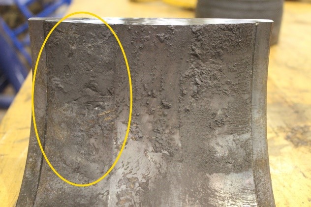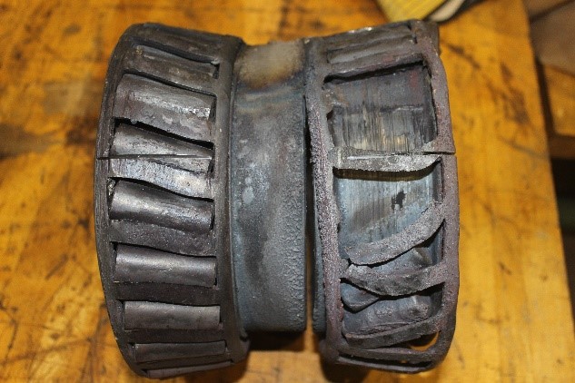 The R1 roller bearing was destroyed, with all its components showing discolouration, smearing, and plastic deformation. The TSB’s examination revealed that the cup raceway showed signs of spalling about 6 inches in circumference on the inner face (Figure 5). This wear most likely led to the gradual failure of the bearing cage and the seizing of the tapered rollers (Figure 6), resulting in the overheating of the assembly, the breaking of the axle and the derailing of car TR 405202.