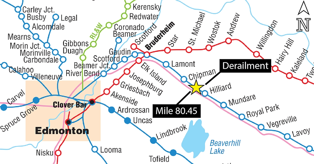 On 29 September 2019 at about 0405,Footnote 1 Canadian National Railway Company (CN) loaded unit grain trainFootnote 2 G86341-28 was proceeding westward at about 41 mph on the Vegreville Subdivision when a train-initiated emergency brake application occurred. Once the train had stopped, the conductor performed a walking inspection and determined that 18 cars (the 69th to the 86th from the head-end locomotive) had derailed. The derailment occurred near Chipman, Alberta, in a rural area located about 36 km northwest of the town of Vegreville, Alberta (Figure 1).