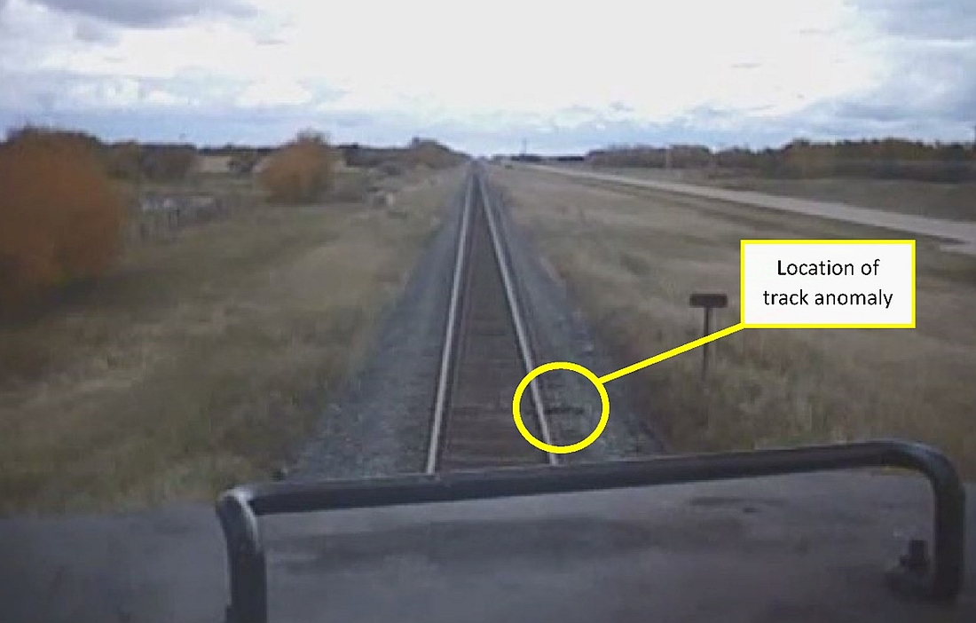 The lead locomotive was equipped with a forward-facing video camera,Footnote 8 but it was inoperative at the time of the occurrence. Forward-facing video footage from a previous train passing this location was obtained.Footnote 9 Based on a review of this recording, a track anomaly was visible, but the details of the defect were indiscernible (Figure 3). In addition, a sound was detected as the locomotive passed the point of derailment, corroborating the existence of a track anomaly.