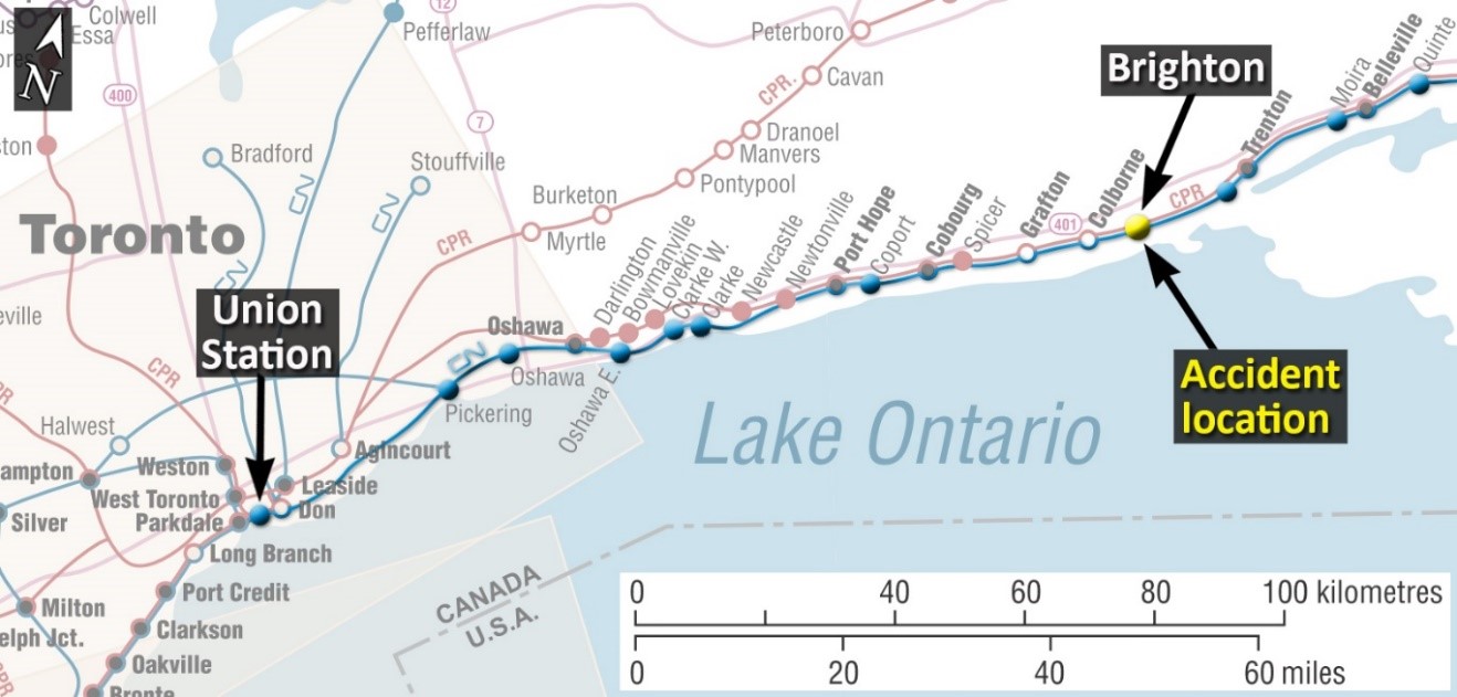 On 02 February 2019, at about 0835,Footnote 1 VIA Rail Canada Inc. (VIA) passenger train 62/52 departed Union Station in Toronto, Ontario, proceeding eastward on the Kingston Subdivision with 302 passengers on board (Figure 1). Train 62/52 was being operated as a “J” trainFootnote 2 from Toronto (Mile 333.8) to Brockville, Ontario (Mile 125.6), where the train would be separated. Train 62 would then continue on to Montréal, Quebec, and Train 52 would continue on to Ottawa, Ontario.