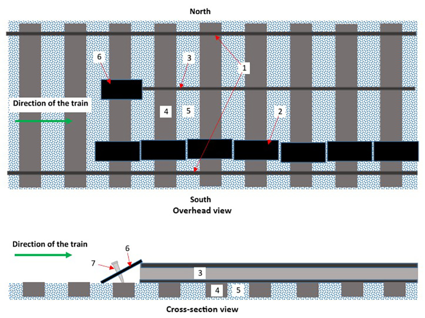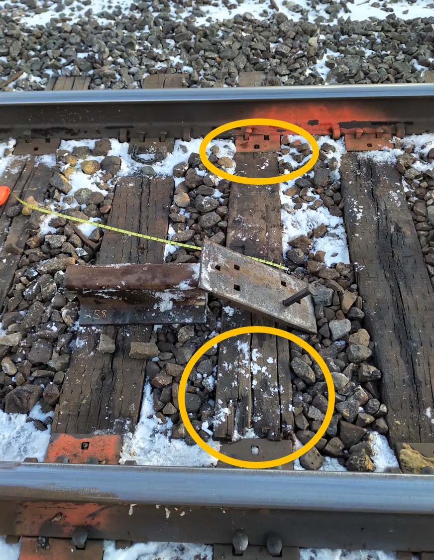 - One angled deflector tie plate (number 6 in Figure 2) was leaned against each butt end of the replacement rail positioned between the rails and secured to a tie with a single track spike (number 7 in Figure 2). The plate was not to sit higher than 1 inch above the running rail of the north track.