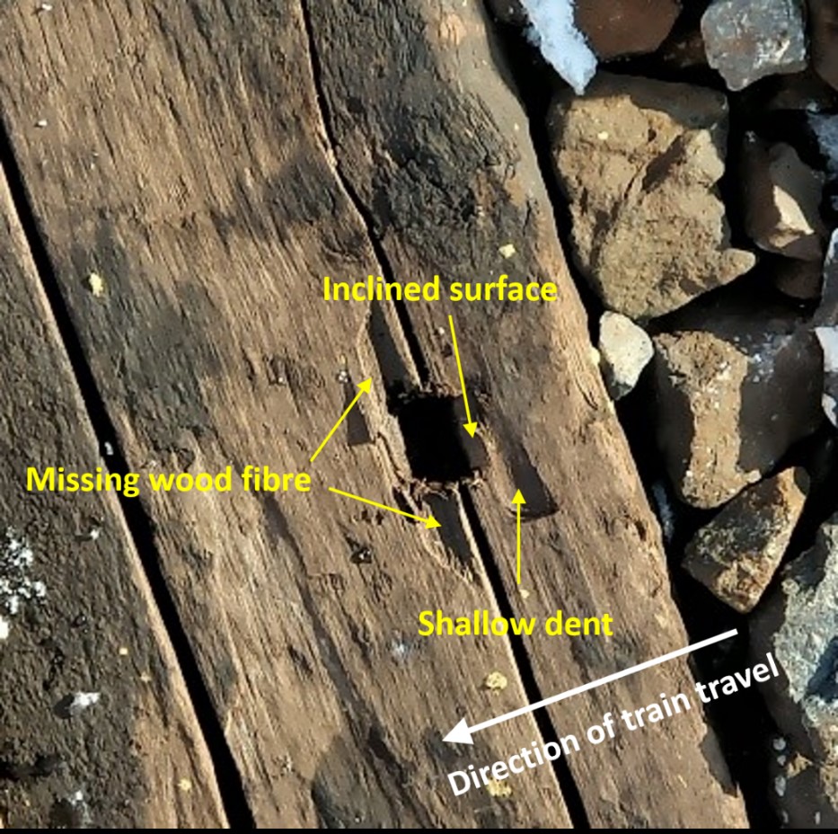 - A shallow piece of wood fibre that was forward of the spike hole was missing, and there was an inclined surface on the top edge of the spike hole. Both of these features were consistent with damage that could have been sustained by a spike that had loosened and rotated backwards.