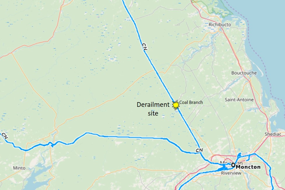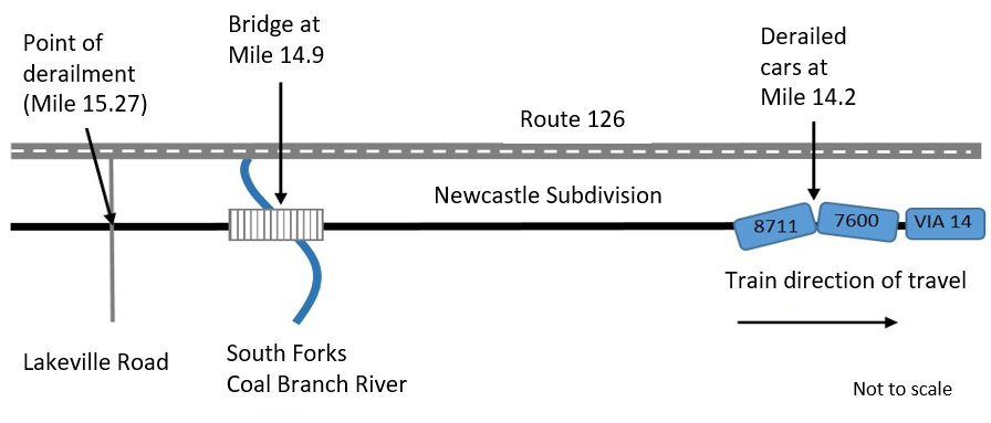 The derailment occurred as the train travelled over the public grade crossing at Mile 15.27 of the Canadian National Railway Company (CN) Newcastle Subdivision, and the rail broke beneath the train. At the crossing, while the train was travelling at approximately 60 mph, the operating crew members experienced rough track conditions. Rough track conditions at crossings are not unusual during the freeze–thaw cycle, because the ground density changes, slightly altering the track geometry. As the 4th car travelled over the crossing, a hard impact was experienced by its occupants. The service manager on board that car immediately reported the hard impact to the operating the crew by radio. The operating crew attributed the reported hard impact to the previously experienced rough track conditions and continued operating the train normally.