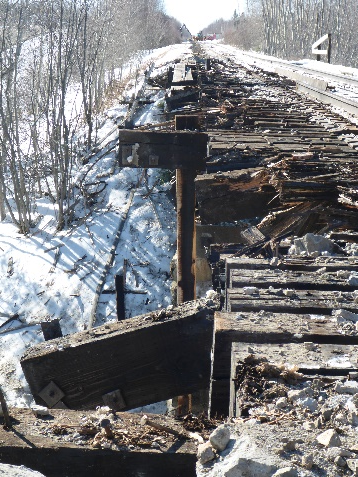 At Mile 14.9 of the CN Newcastle Subdivision, there was an open-deck steel bridge. The bridge was 133.5 feet in length, with 2 stone abutments, 2 stone piers, and a concrete bridge seat. On the bridge, the track consisted of 100-pound rail, with 100-pound guard rails (also called Jordan rails)Footnote 3 installed at a 9-inch offset. The stone abutment on the northwest side of the bridge had sustained impact damage from one of the derailed cars. About 100 ties and the guard rails had also sustained damage during the occurrence (figures 4 and 5).