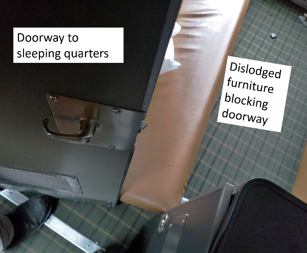 The interior of the 14th car (VIA 8711) had sustained damage. Loose items such as coffee machines and folding chairs were displaced within the car. Folding benches and armchairs were dislodged, blocking a doorway to the sleeping quarters (Figure 7). Ceiling panels had partially dislodged over the panoramic seating area (Figure 8).