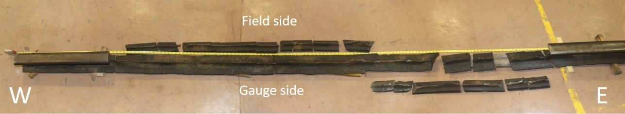 - Of the multiple rail pieces recovered, 1 piece, located between 40 and 46 inches from the easternmost fracture point of the rail, had a deep gouge on the field side.